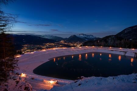 Nach der stimmungsvollen Auffahrt in der Dämmerung zur Mittelstation der Jennerbahn führt die Wanderung durch die winterliche Bergidylle zum Speicherteich. Mit Laternen ausgestattet, lauscht man in Begleitung eines einheimischen Erzählers seinen spannenden Geschichten. Zu den Klängen der Weisenbläser bietet sich ein unvergesslicher Ausblick auf die Berge und den hell erleuchteten Berchtesgadener Talkessel. Zum Abschluss lockt auf der Terrasse an der Berggaststätte „Halbzeit“ wärmender Glühwein oder alkoholfreier Punsch und weihnachtliches Gebäck.